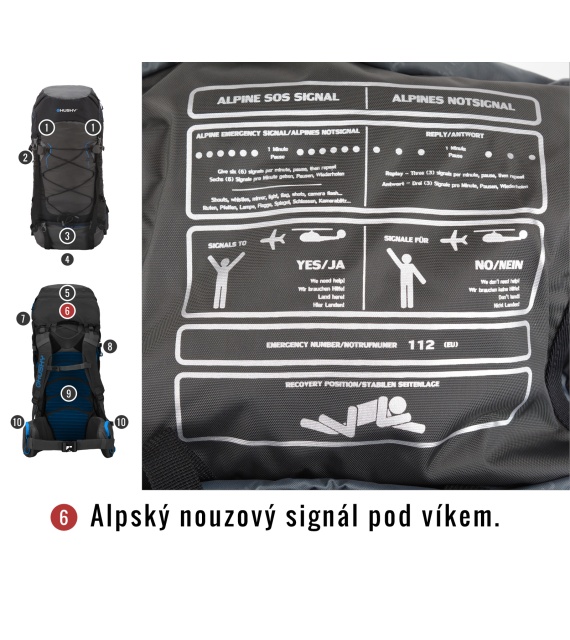 Removable cover, chest strap, waist belt, raincoat, emergency symbols.