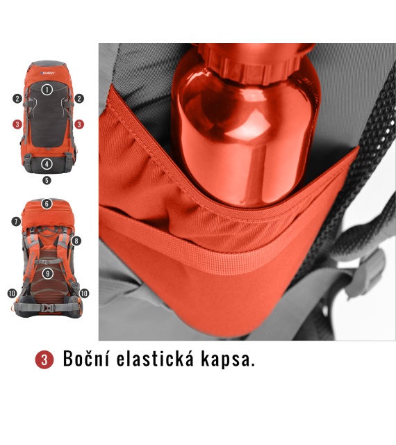 • Features of the Rony backpack: 2 main compartments with side access to the backpack; front elastic pocket; chest strap; side and bottom compression straps; holders for skis or other gear; height-adjustable top lid with pocket; removable top lid that may be used as a bum bag; side elastic pockets; preparation for hydrobag; rain cover; reflective elements; whistle.