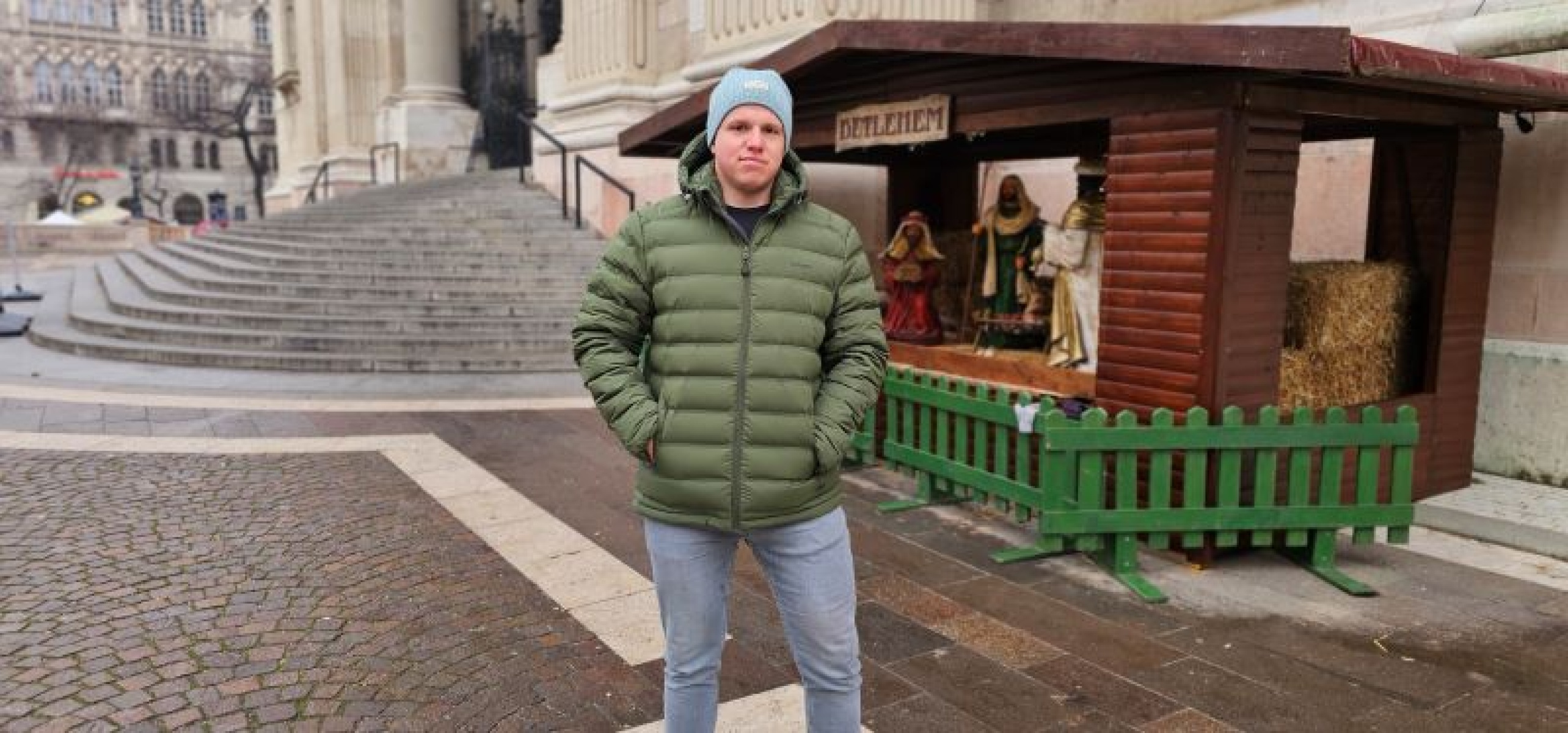 A men’s lightweight hooded down jacket suitable for winter weather.