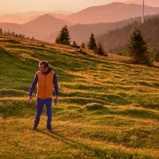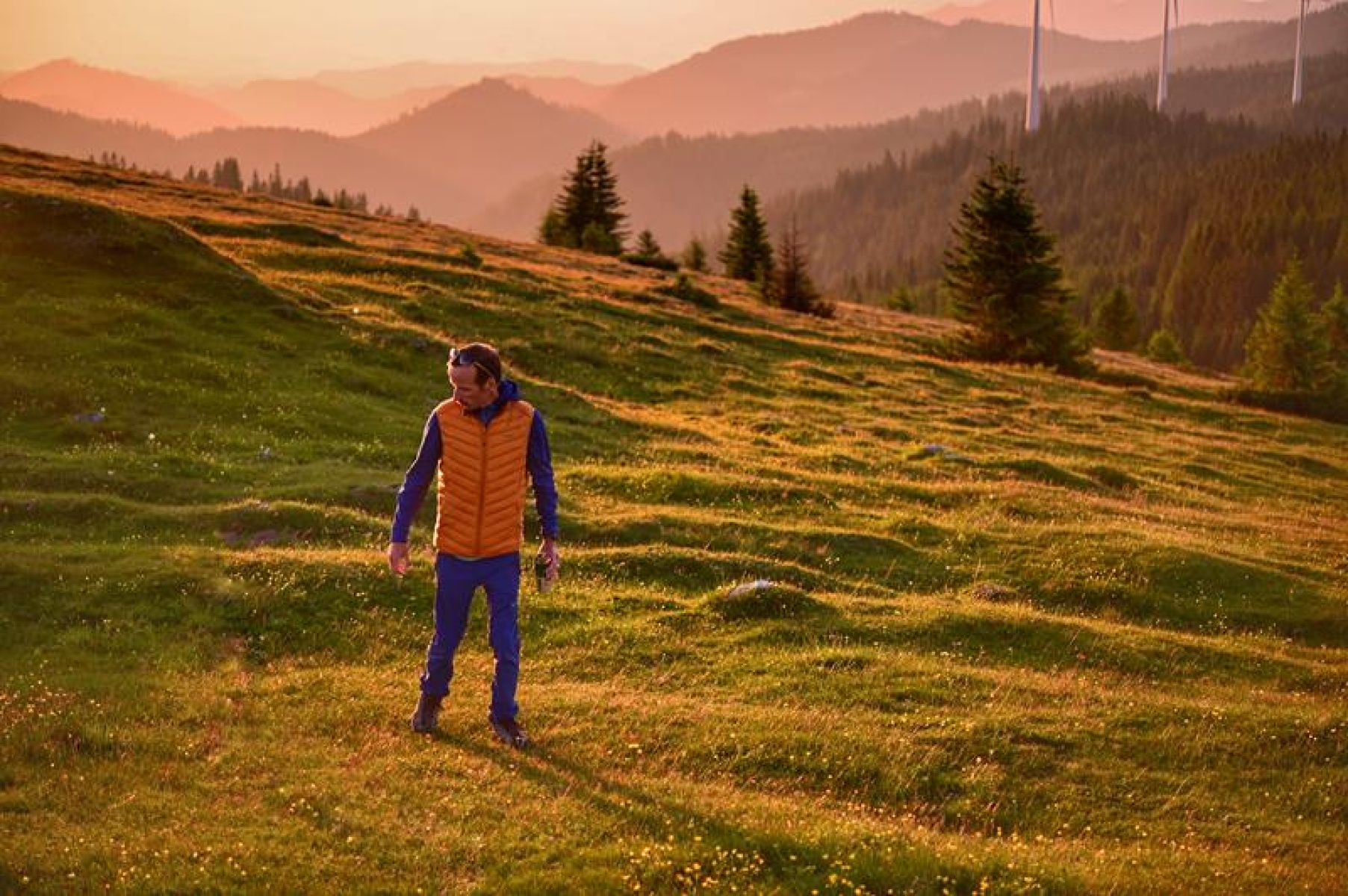 A light, men’s, zip-up gilet suitable for hiking and other outdoor activities on colder days.