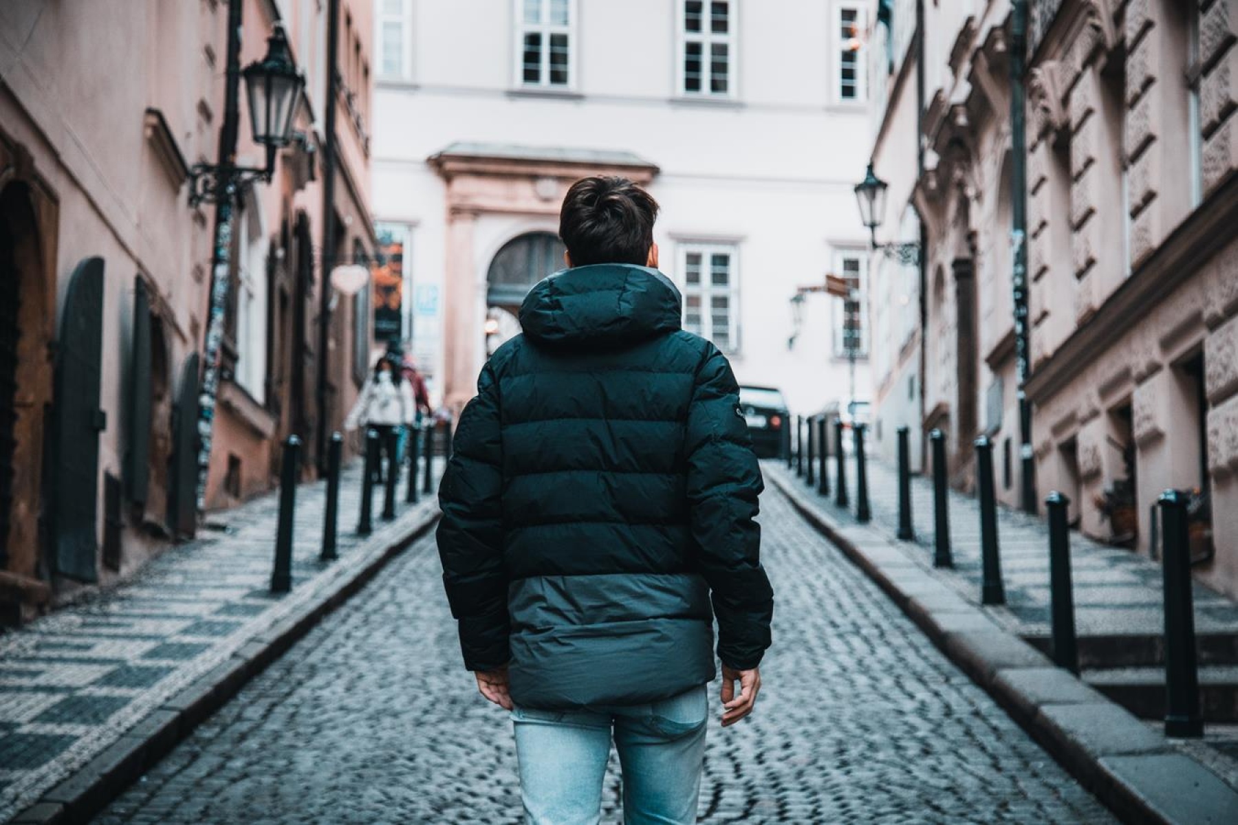 A men’s lightweight hooded down jacket suitable for winter weather.