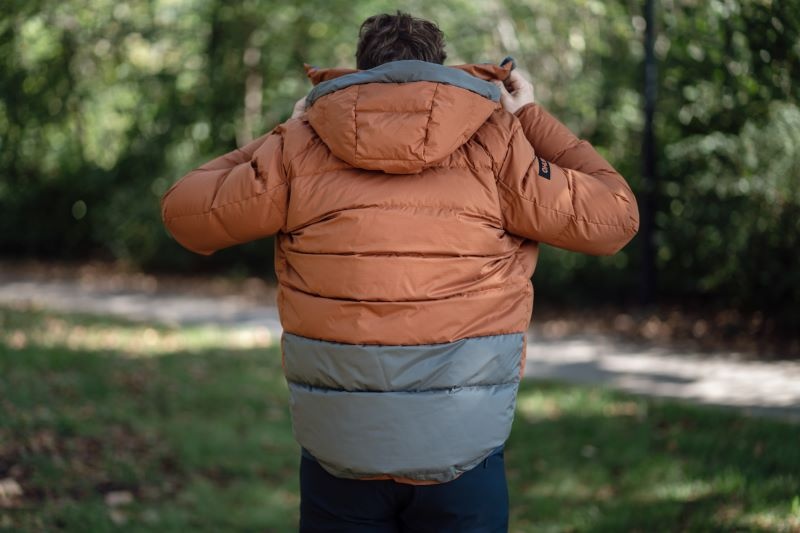 A men’s lightweight hooded down jacket suitable for winter weather.