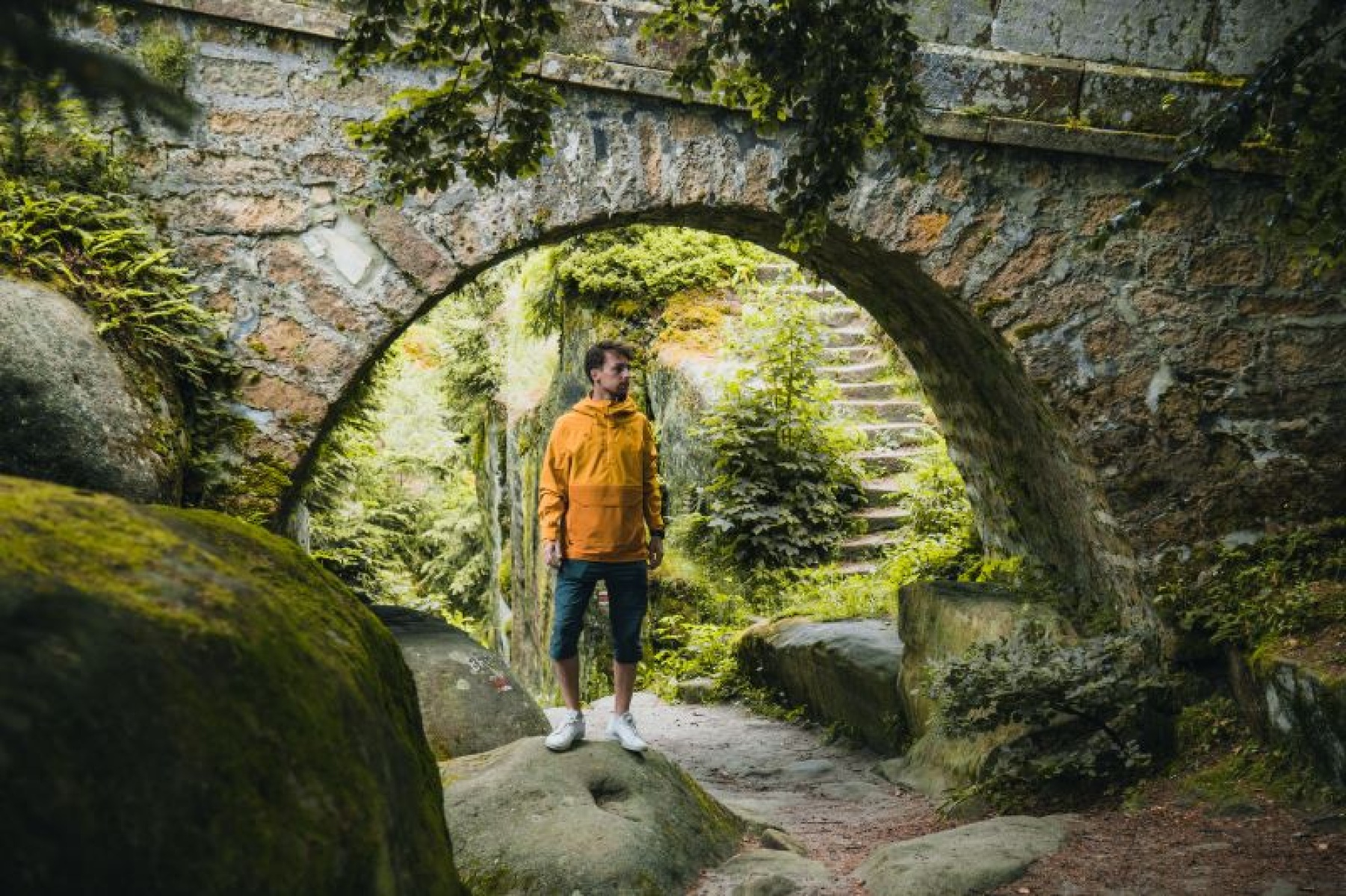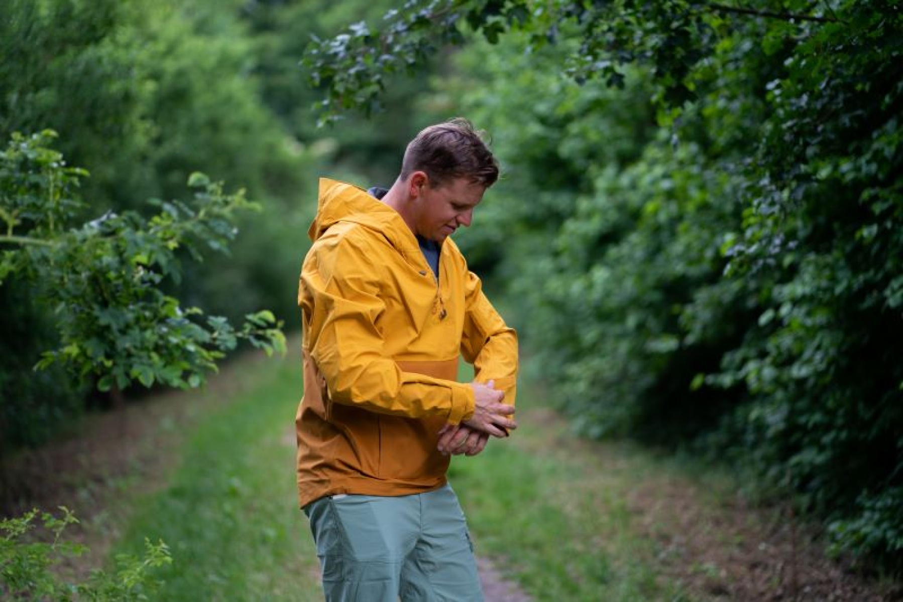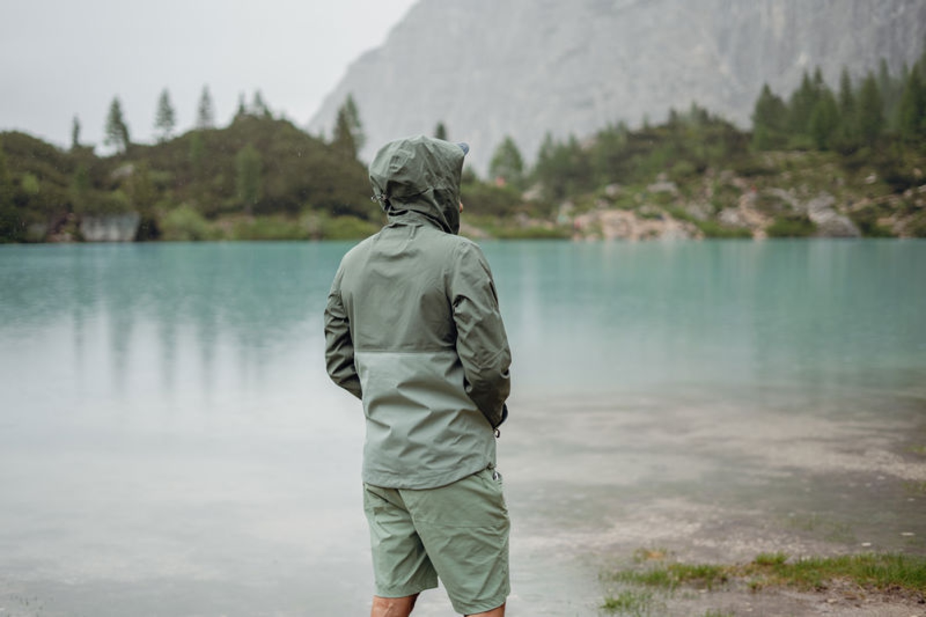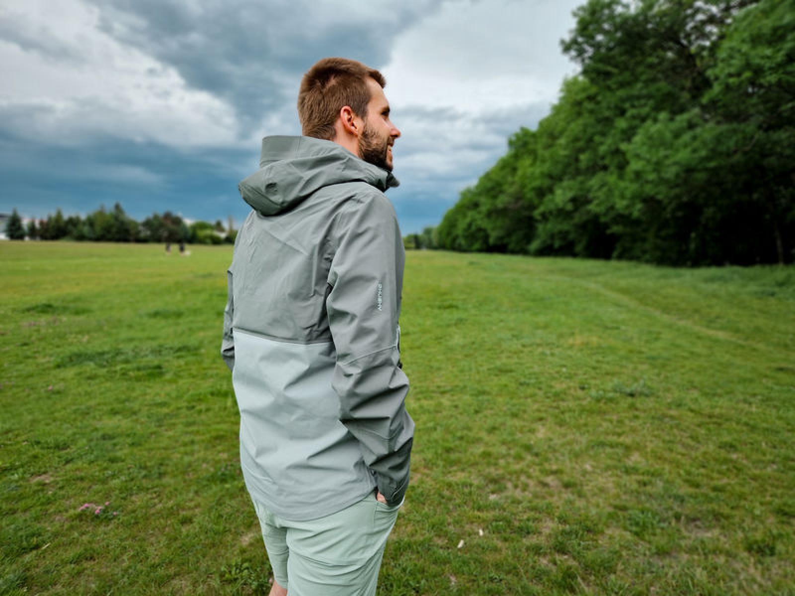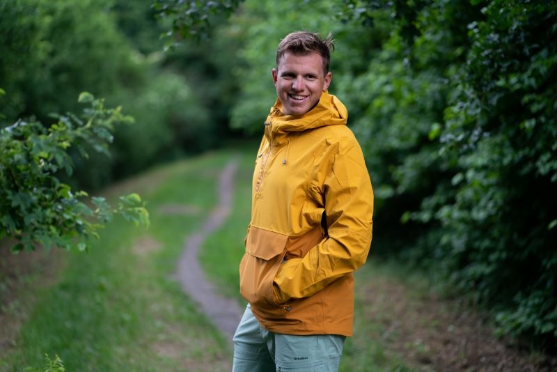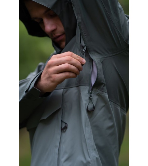 Multifunctional men’s outdoor jacket with hood, for year-round use in demanding conditions, worn both in the countryside for hiking and in the city.