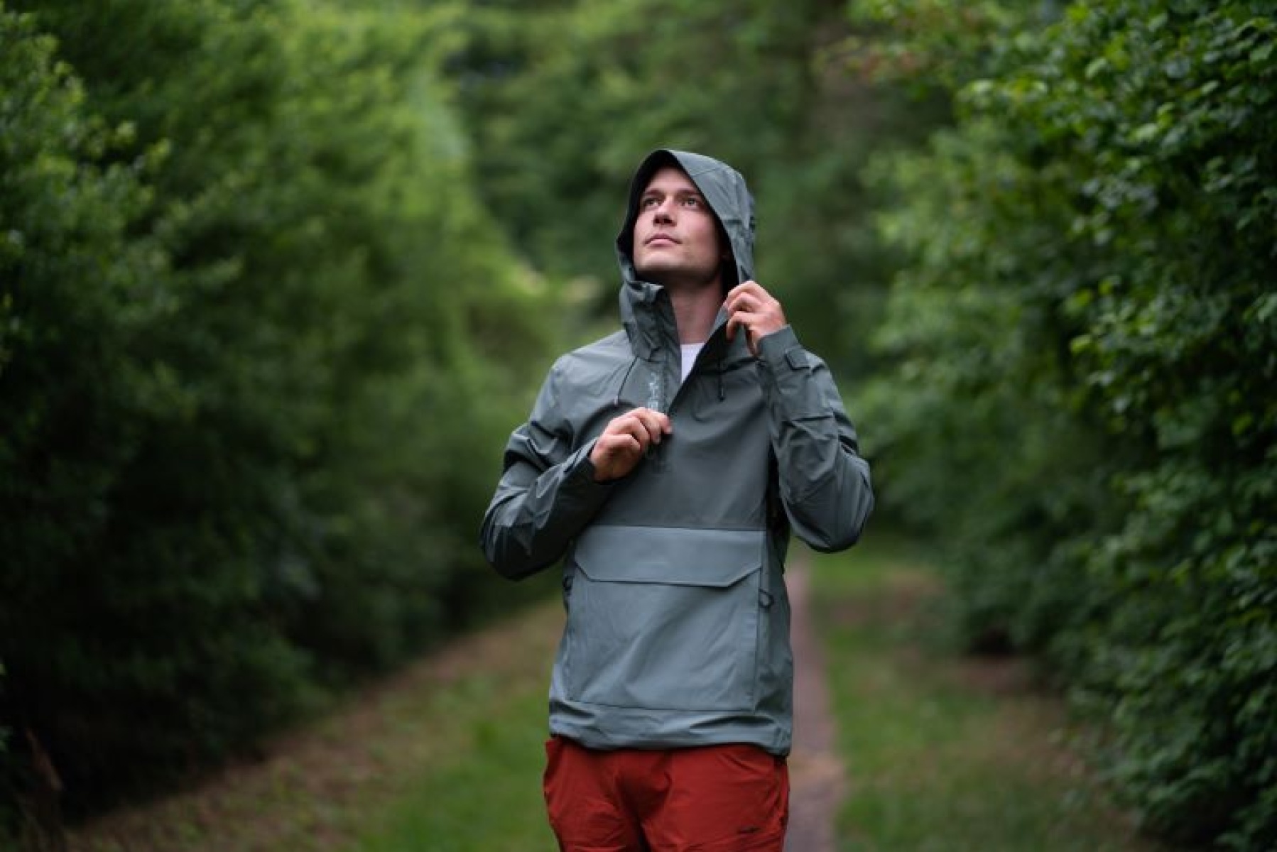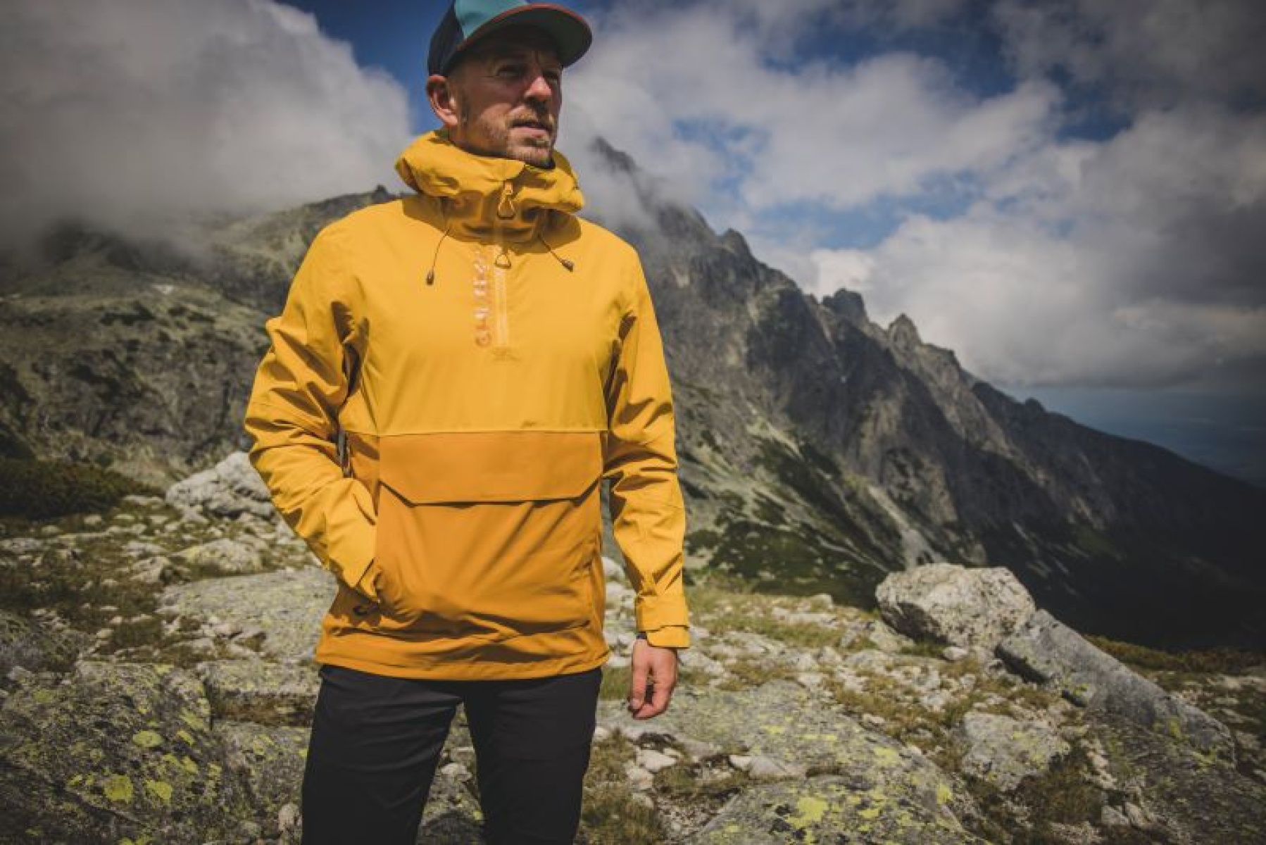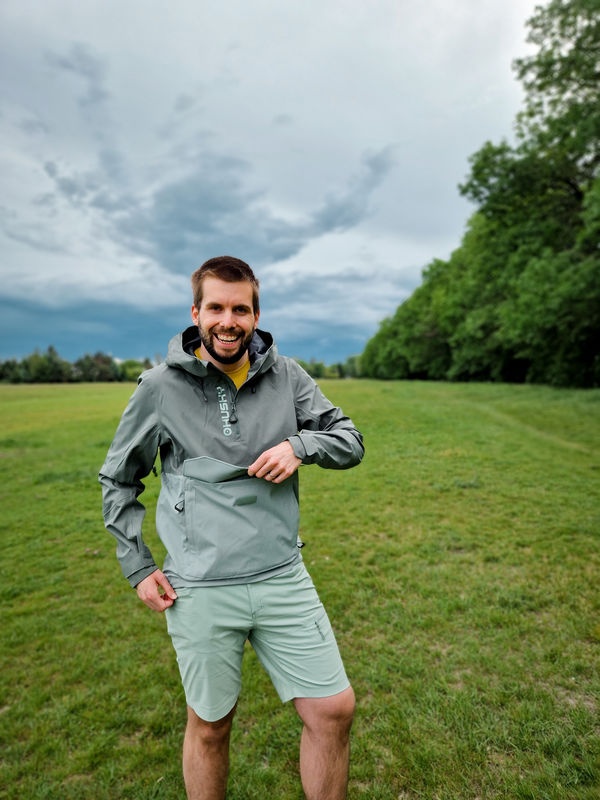 Multifunctional men’s outdoor jacket with hood, for year-round use in demanding conditions, worn both in the countryside for hiking and in the city.
