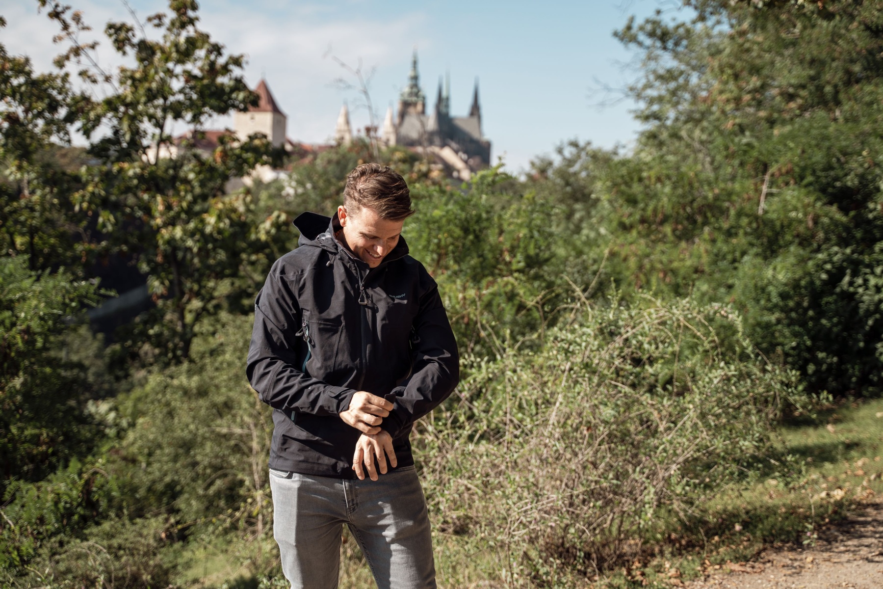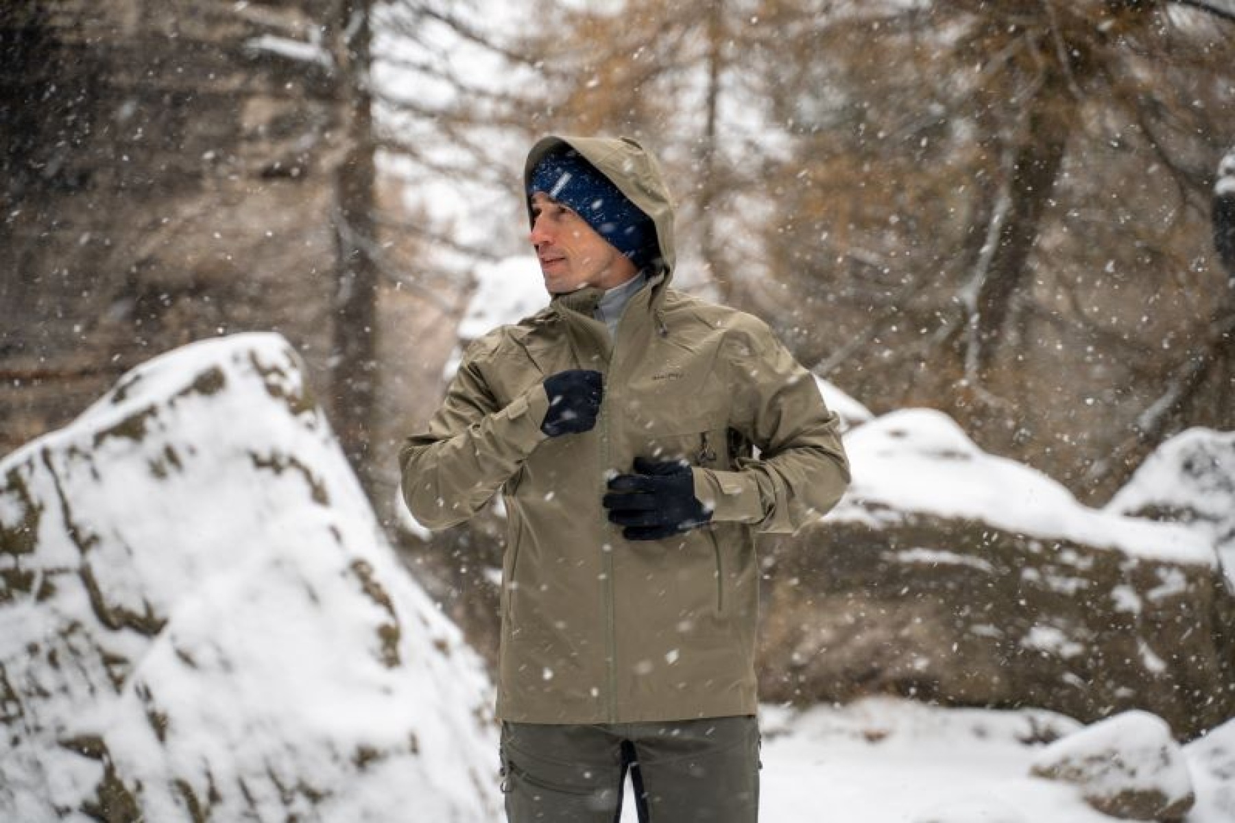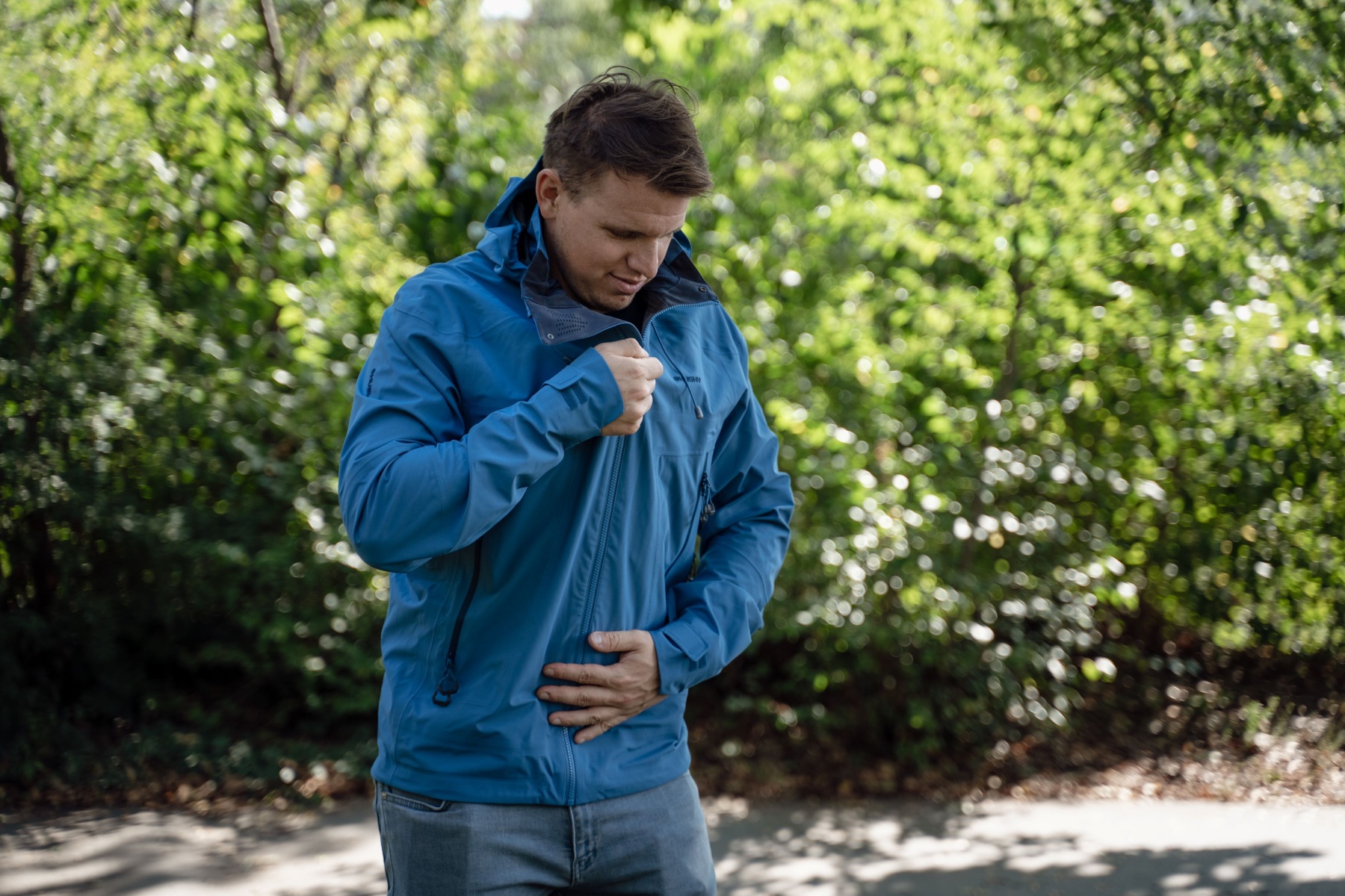A multifunctional men’s hooded outdoor jacket for year-round use, both around town and for hiking.