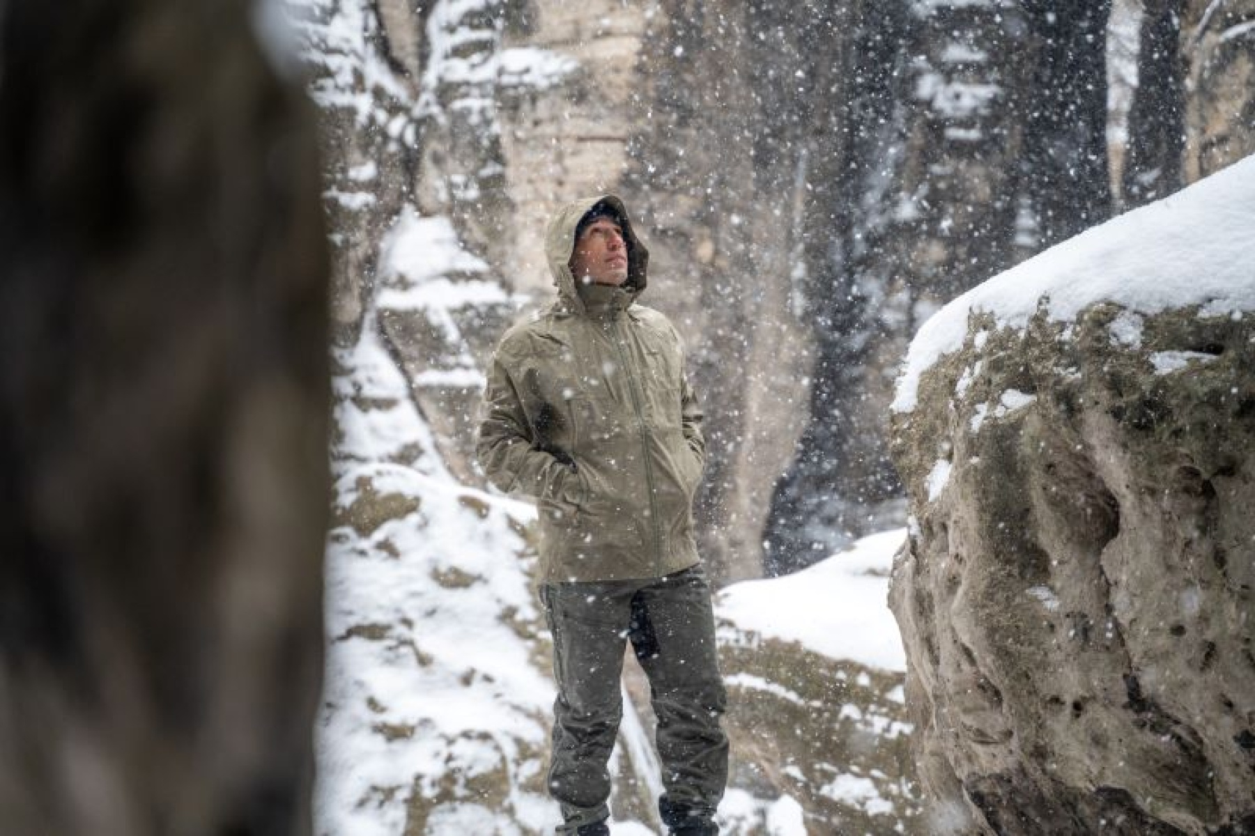 A multifunctional men’s hooded outdoor jacket for year-round use, both around town and for hiking.