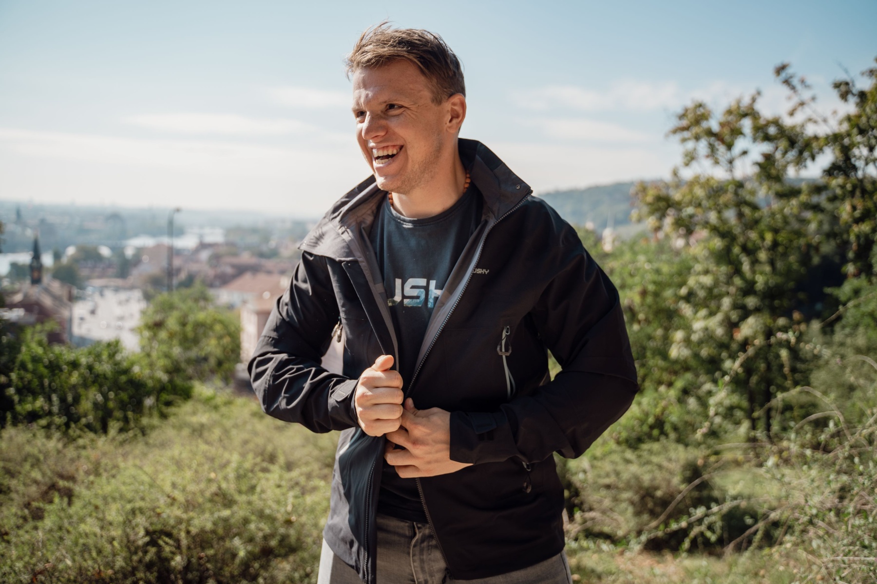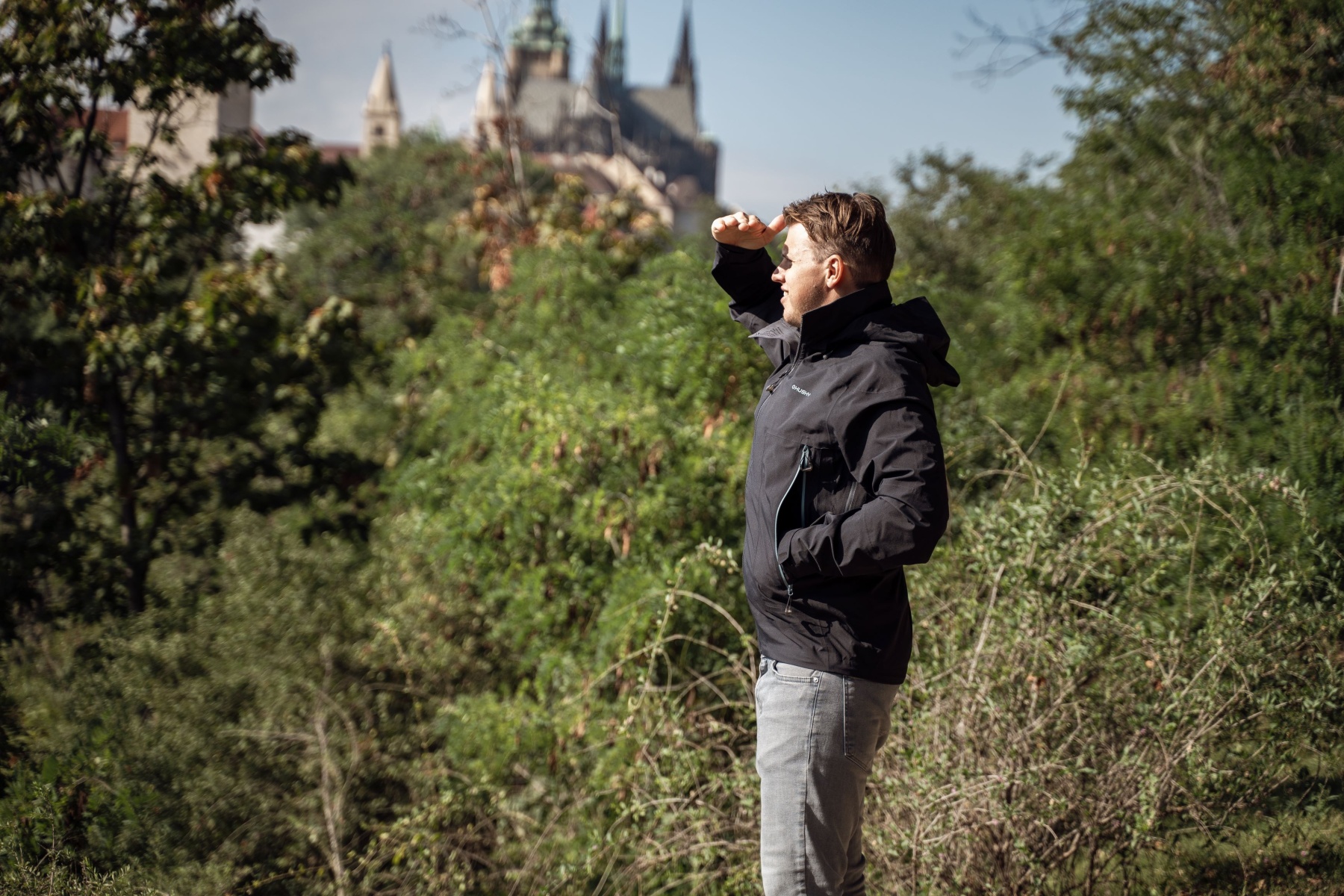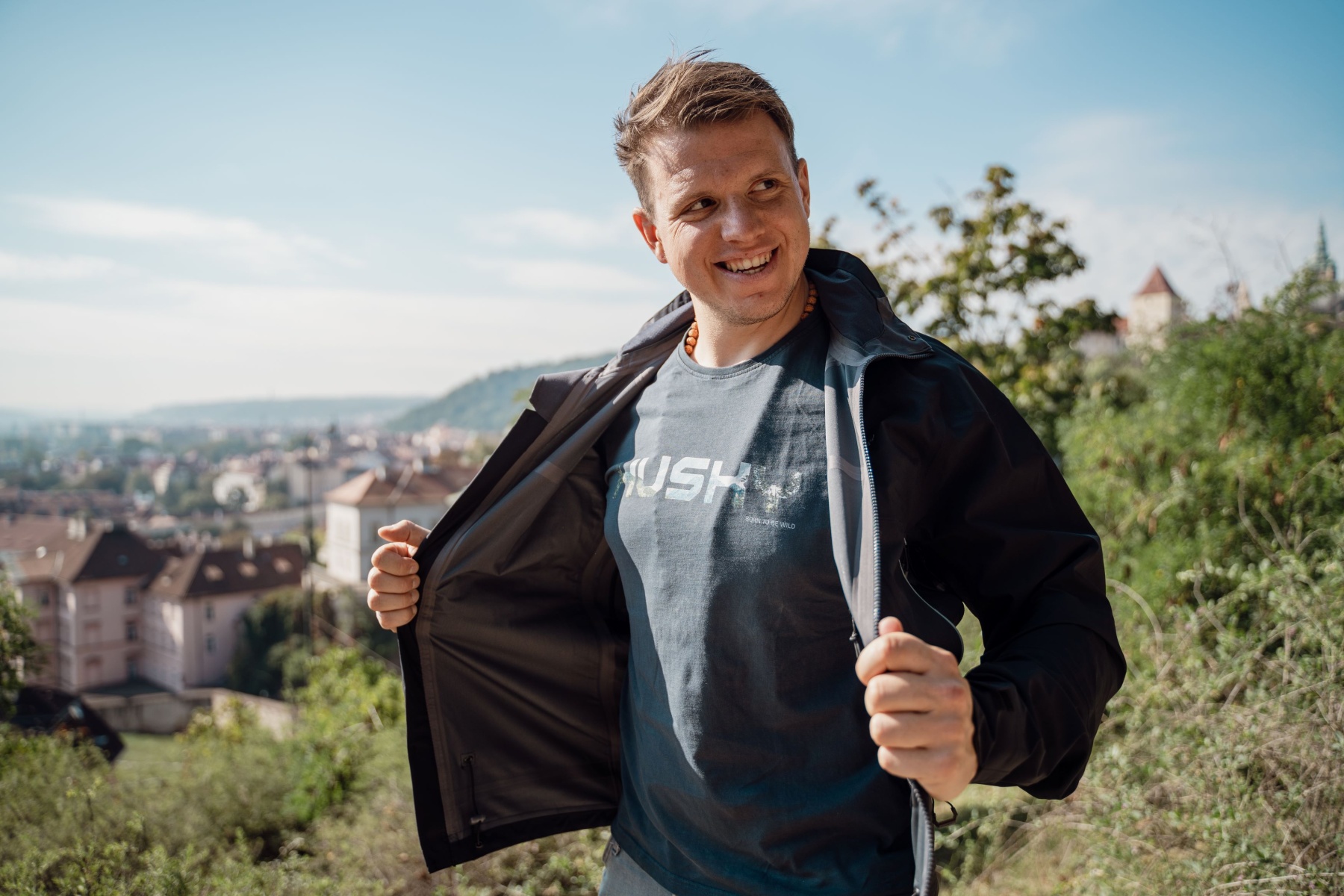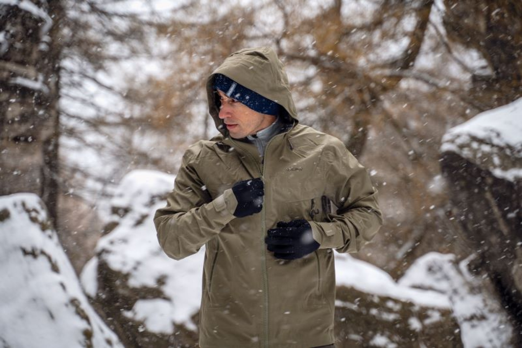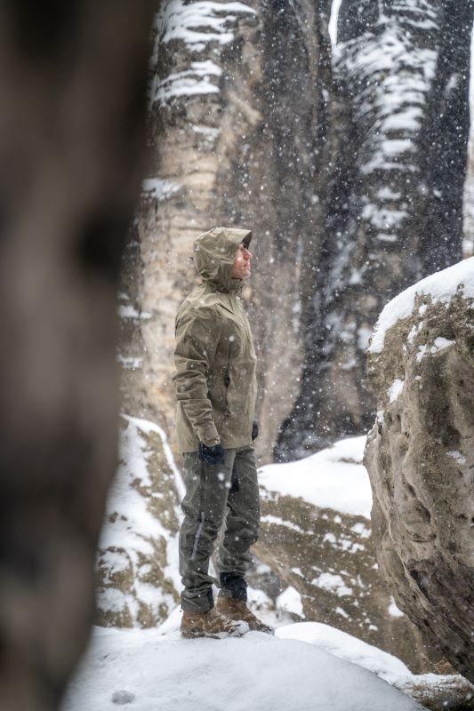 A multifunctional men’s hooded outdoor jacket for year-round use, both around town and for hiking.