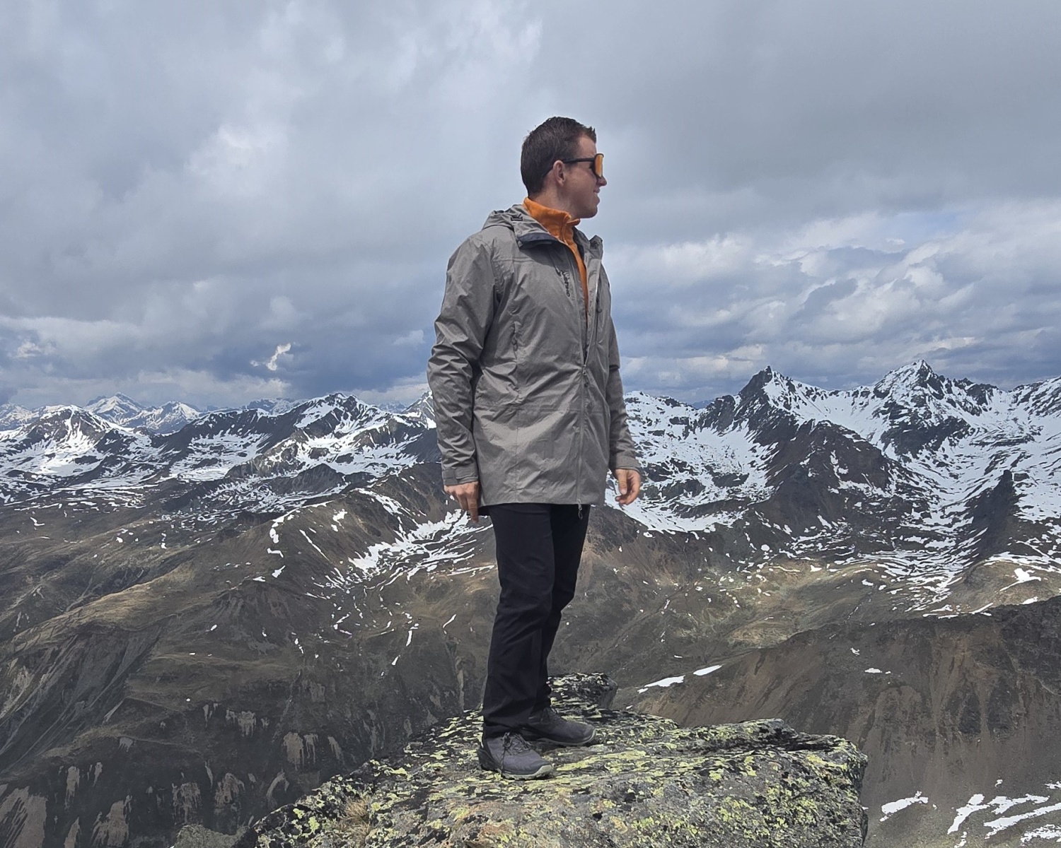 A men’s hardshell membrane coat for everyday wear around town and for hiking in the spring and summer.