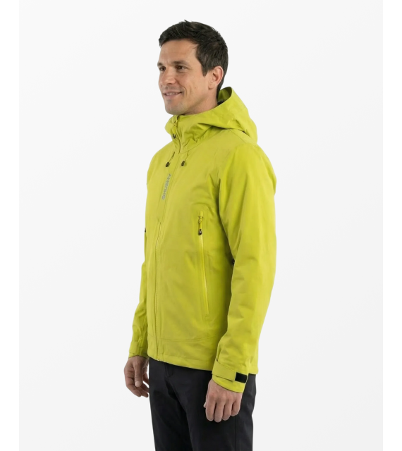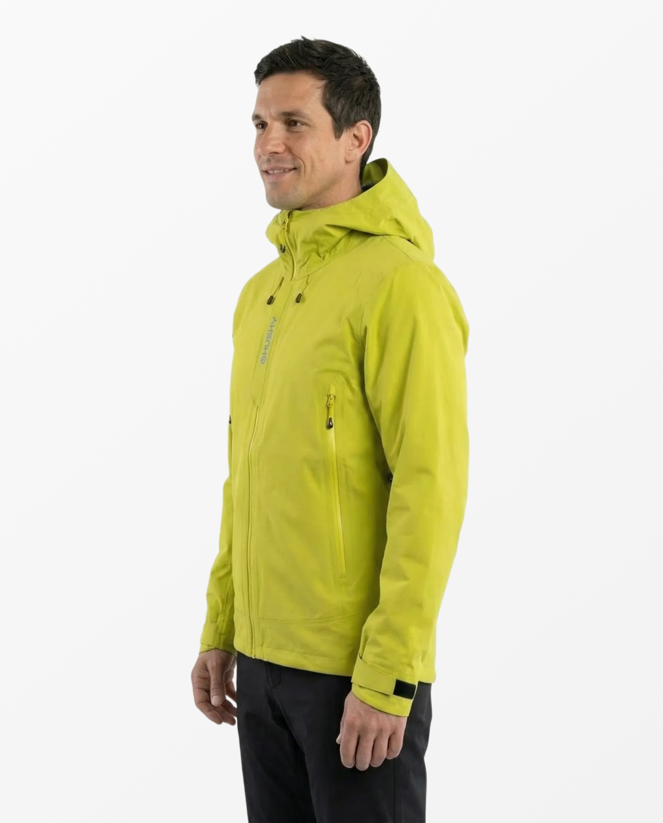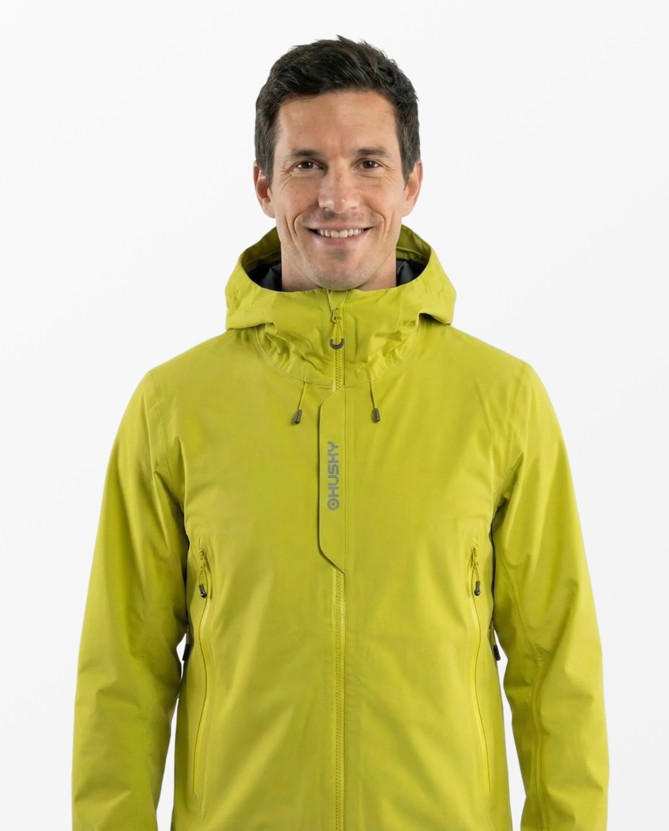 A versatile men's outdoor jacket with a hood for year-round use, suitable for both city wear and hiking in nature.