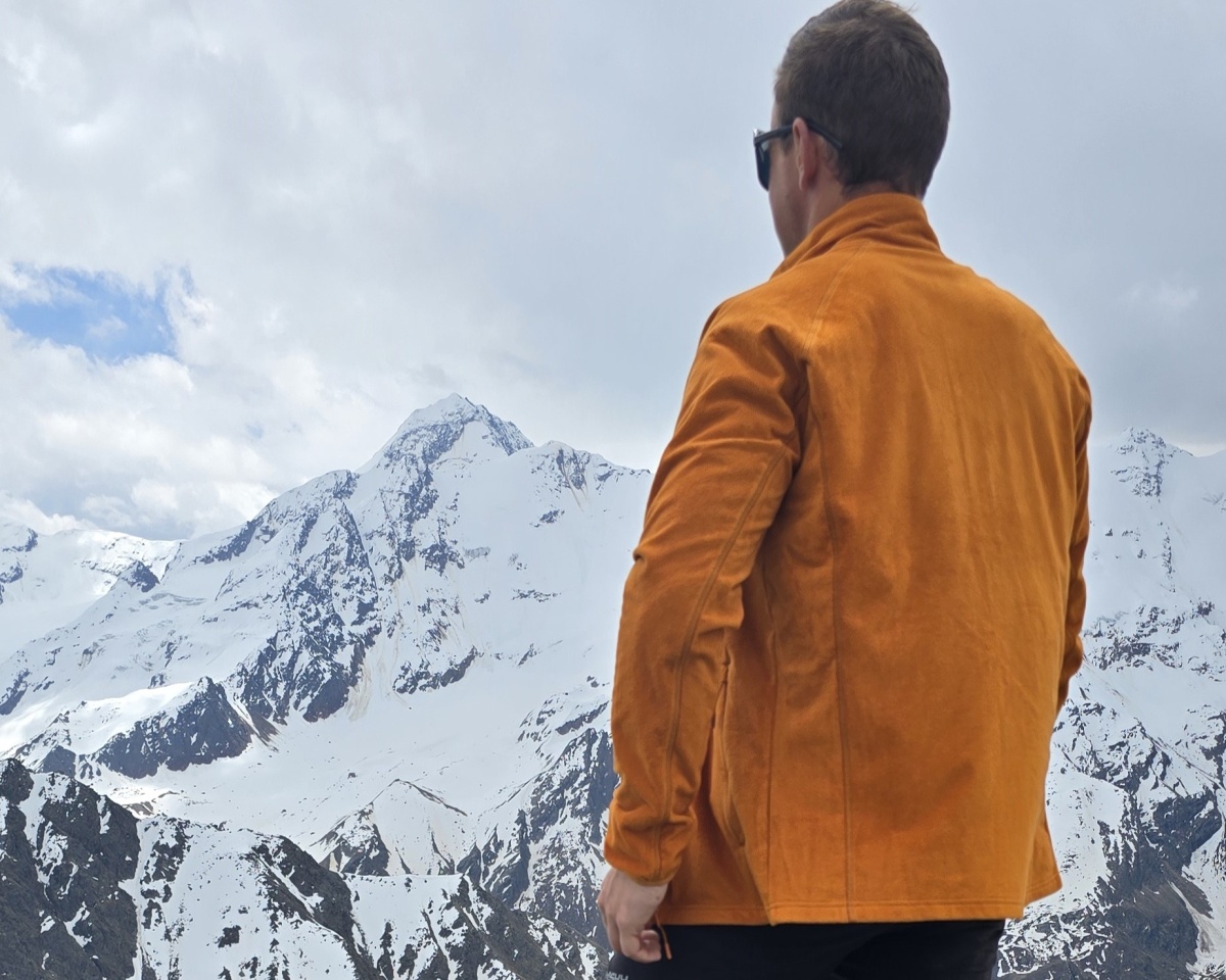 A moderately thick men’s stand-up collar, zippered sweater suitable for various outdoor activities.