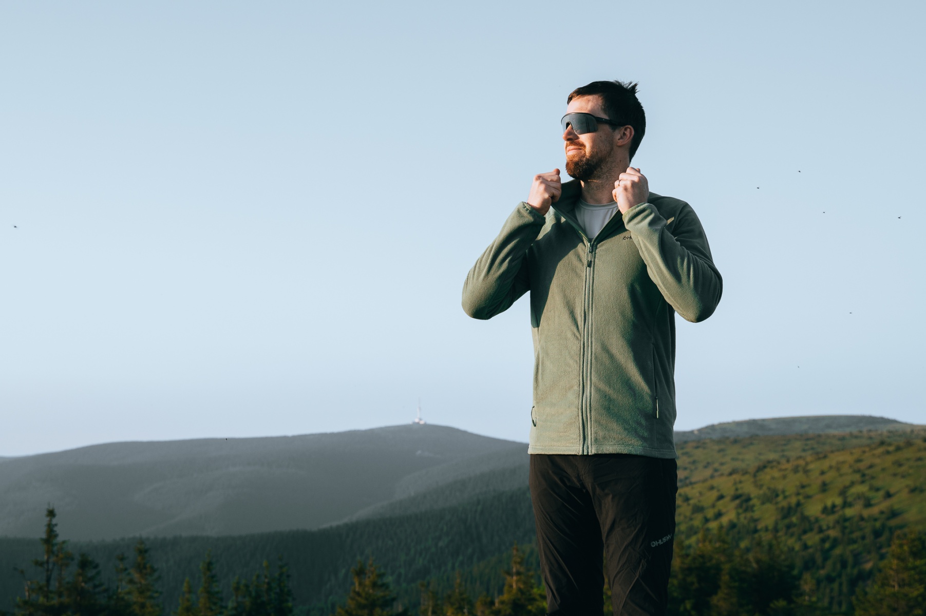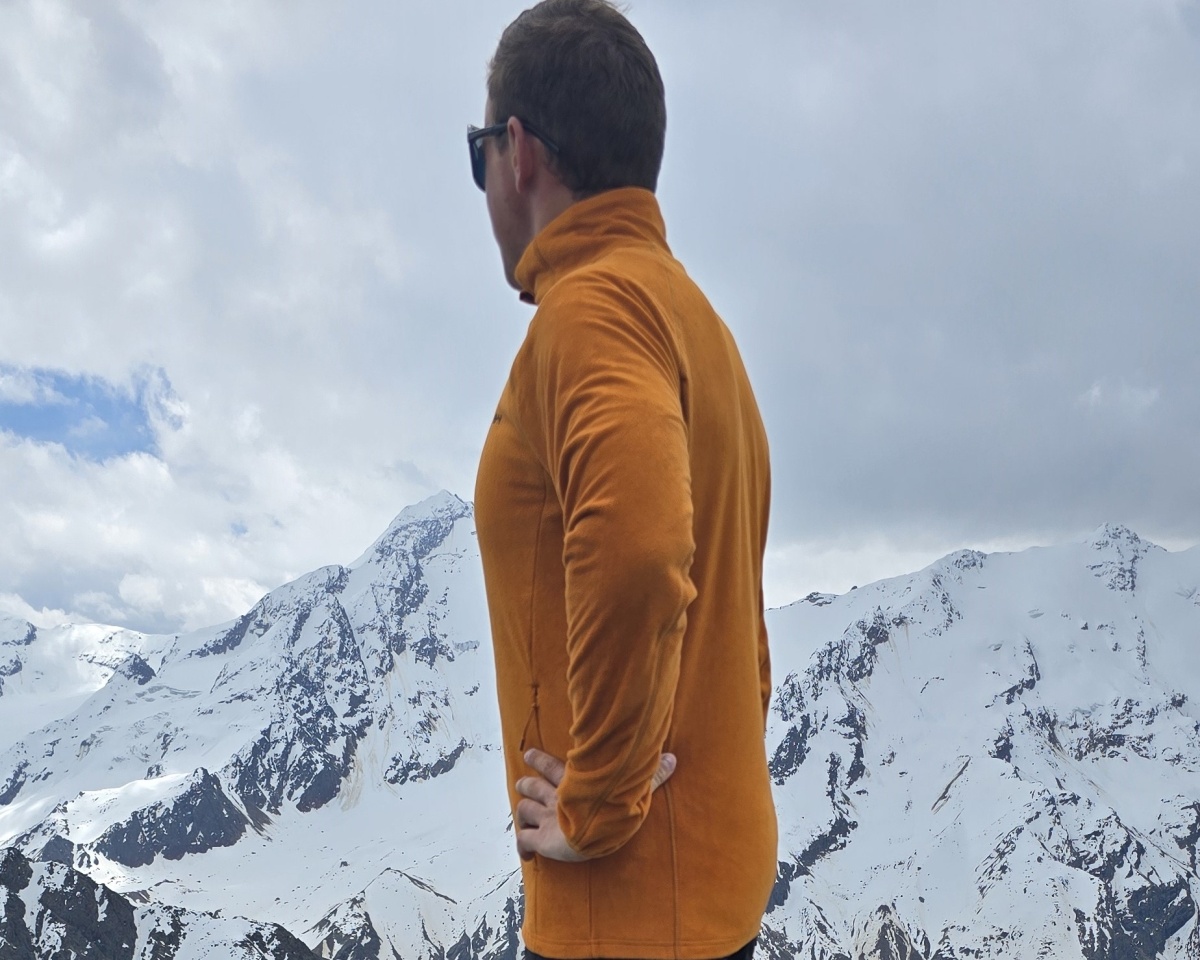 A moderately thick men’s stand-up collar, zippered sweater suitable for various outdoor activities.