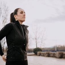 A lightweight women’s zippered gilet suitable for various sports and outdoor activities on colder days.