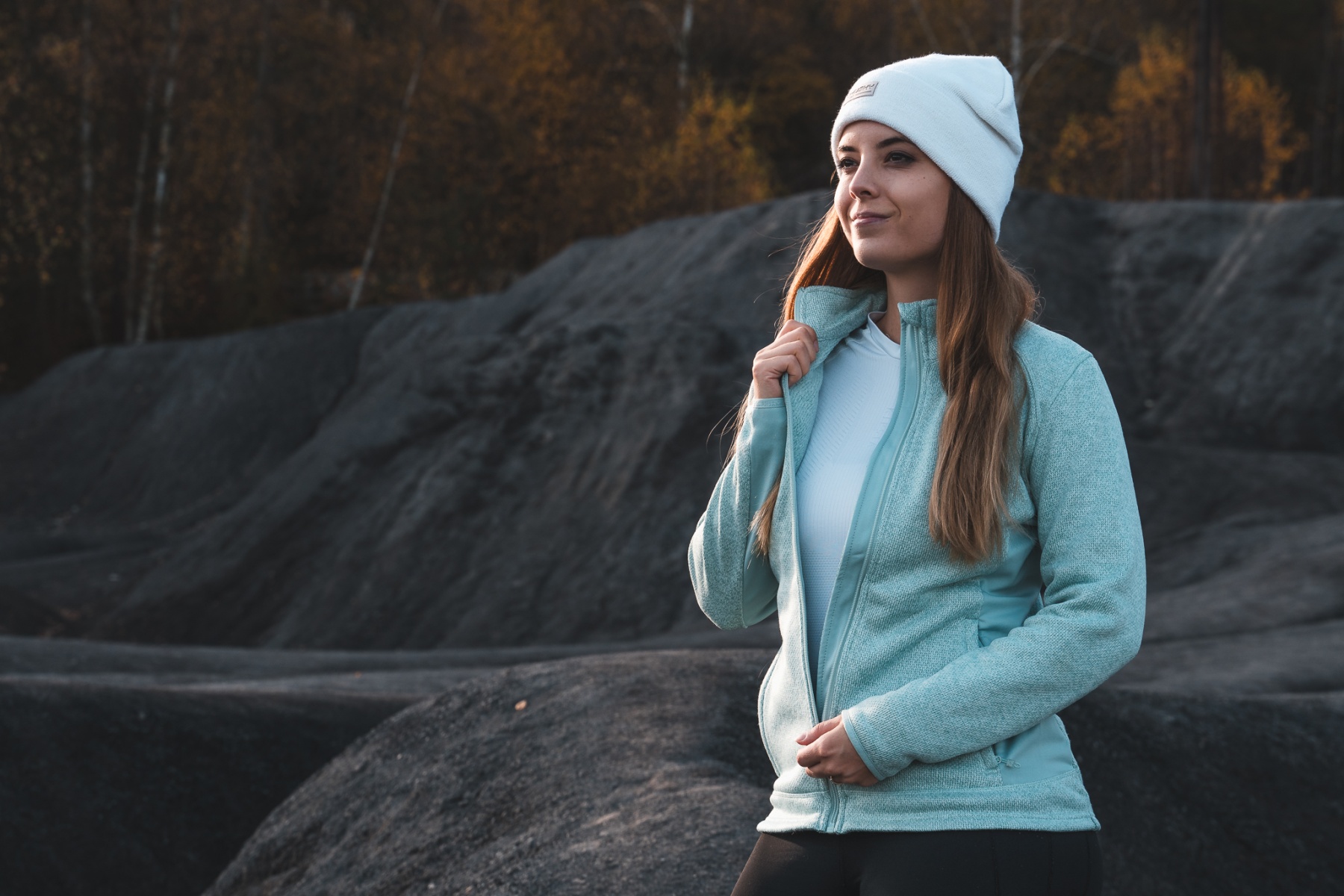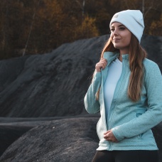 A moderately thick women’s zip-up sweater suitable for various outdoor activities, e.g. hiking.