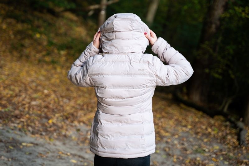 A women’s lightweight jacket with a hood for wearing on cold days around town and in the country.
